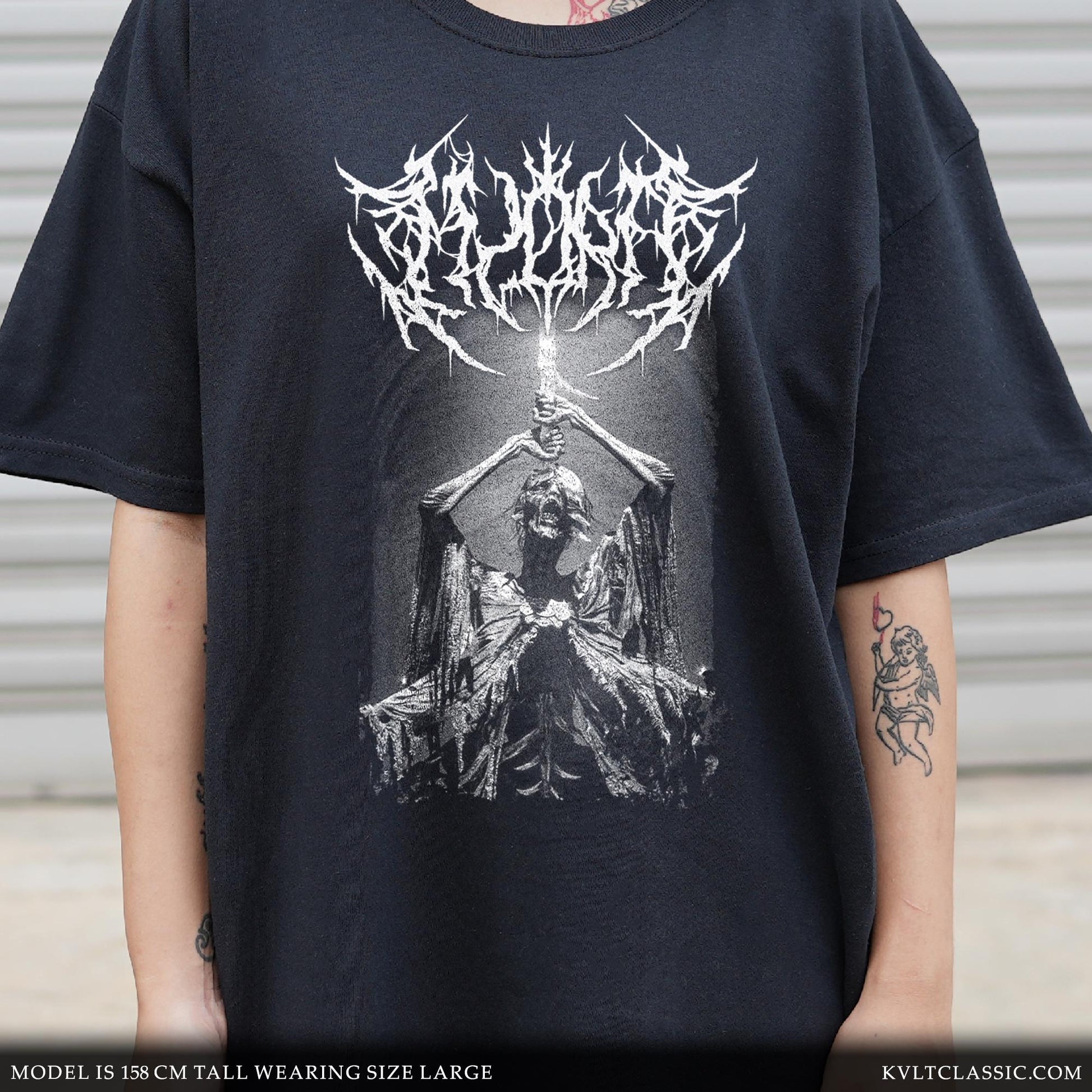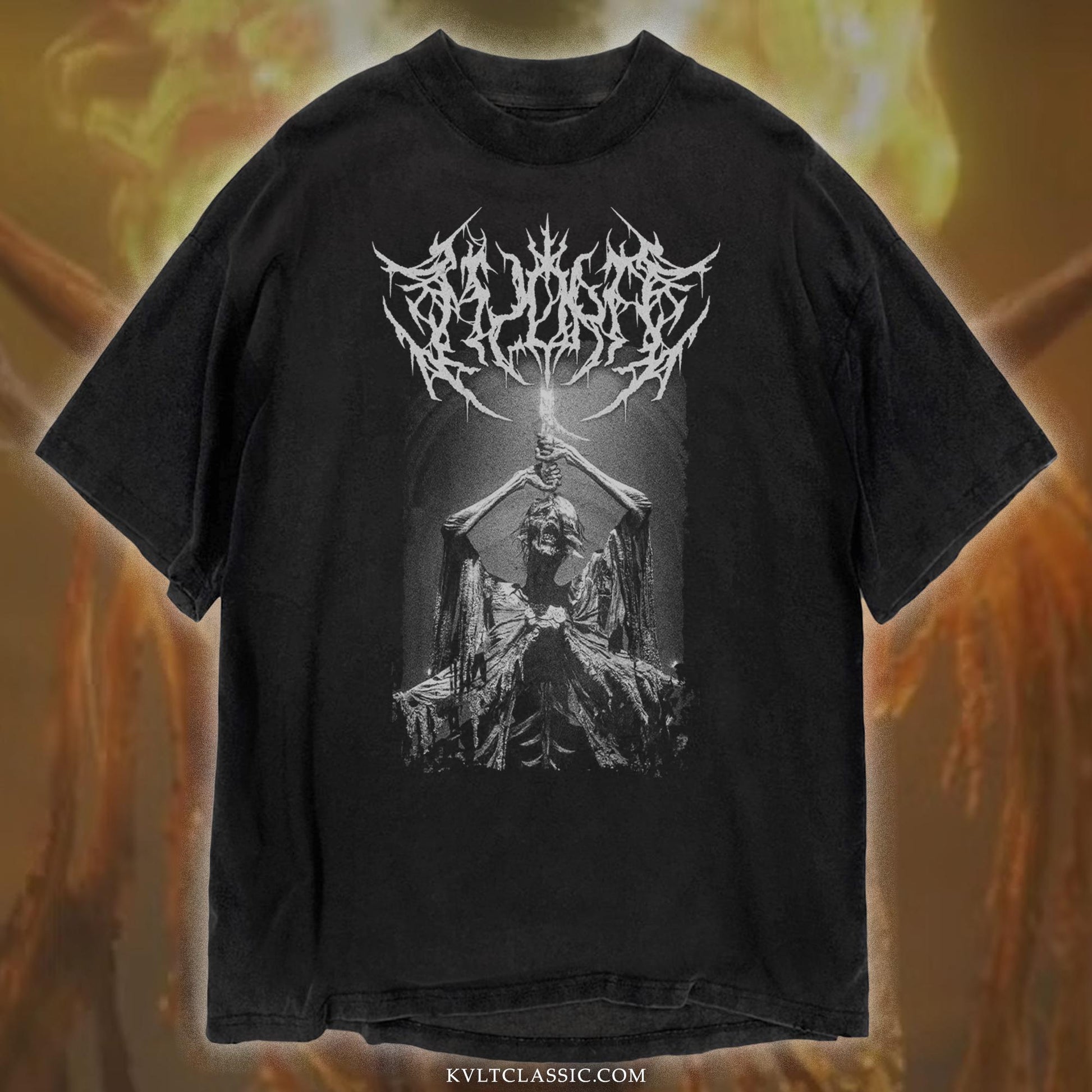 An original tribute to Elden Ring Shadow Of The Erdtree DLC by FromSoftware and Hidetaka Miyazaki, reimagining Midra, Lord of the Frenzied Flame in the style of metal band merchandise.