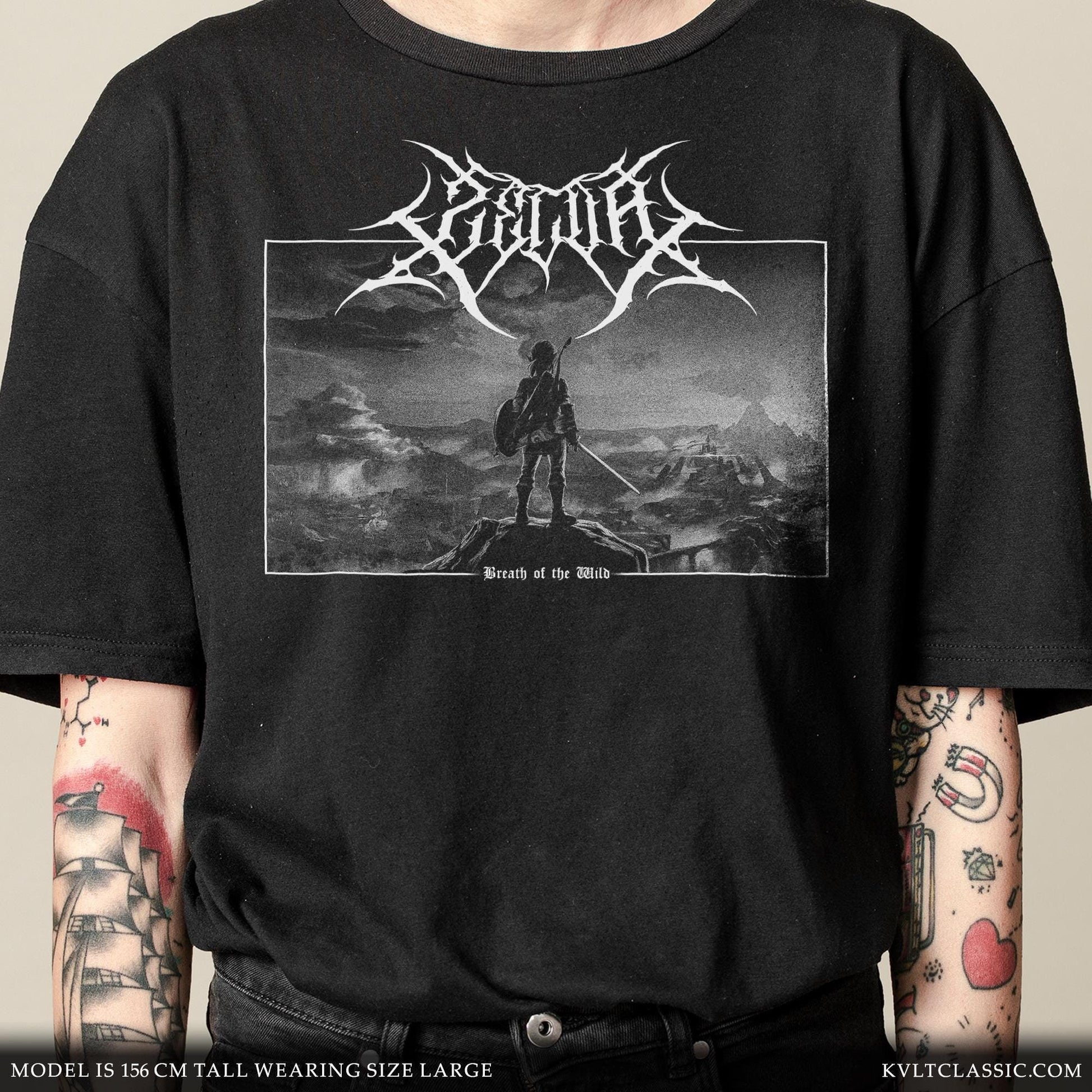 A tribute to The Legend of Zelda Breath of the Wild, reimagining a scene from the Nintendo Switch Video game in the style of metal band merchandise, with the name of Zelda written in a custom heavy metal font.